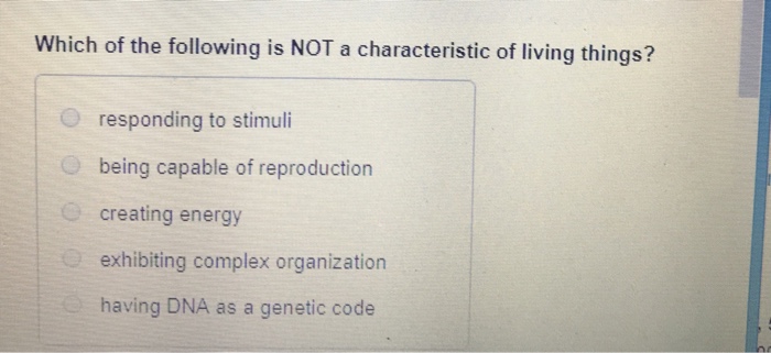 The following that is not a characteristics that all living things share is a. Any living thing is called a (n) q. Select the correct option (s) and click submit. Which one of the following is a characteristic of all living things? Response to the environment d.